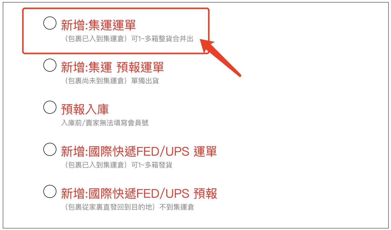 【新增集運預報運單】:(包裹尚未到集運倉)不合箱 單獨快速出庫
