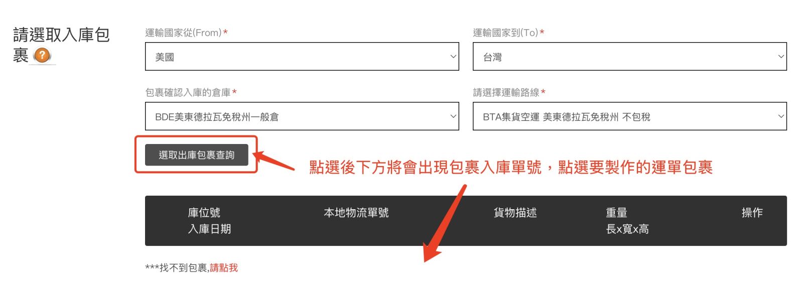 ,選擇運輸路線點選完包裹相關資訊後,按【選取出庫包裹查詢】
