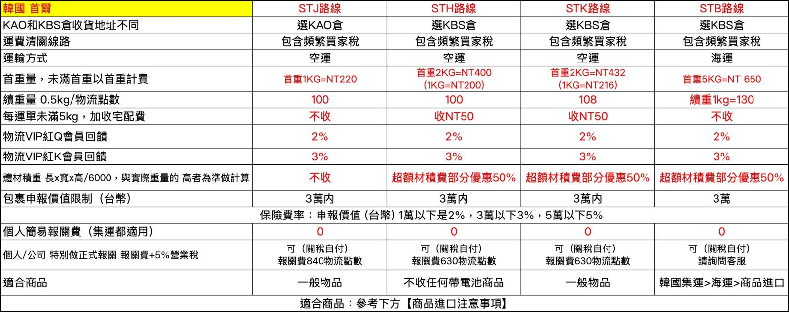 | KBS韓國首爾空運&海運一般倉 | 0 | 0.00 kg(公斤) | 0 /kg(公斤) | 5 / 天kg(公斤) | 0 /kg(公斤) | 100 / 包裹 | 25 | 35 |