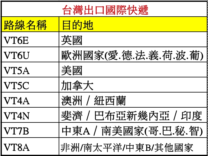 +國際快遞包裹 台灣出口到 世界各國: