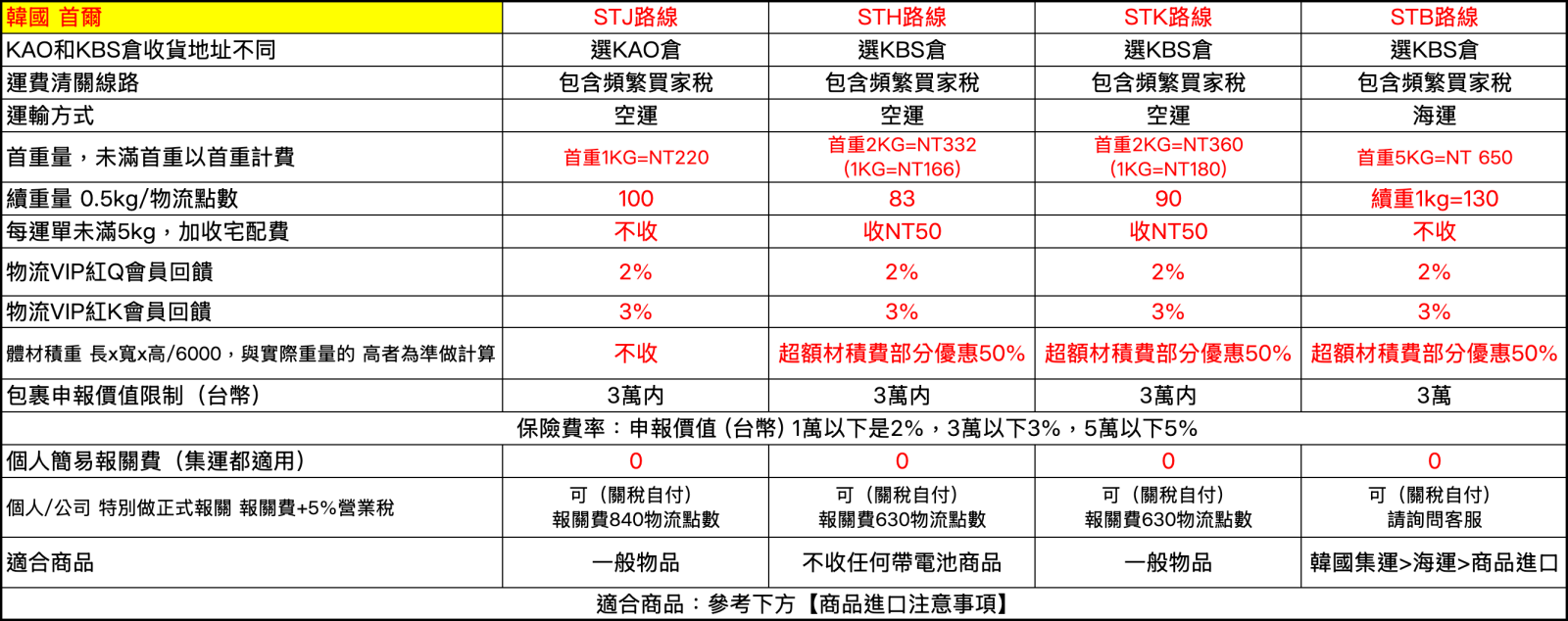 | KBS韓國首爾空運&海運一般倉 | 0 | 0.00 kg(公斤) | 0 /kg(公斤) | 5 / 天kg(公斤) | 0 /kg(公斤) | 100 / 包裹 | 25 | 35 |