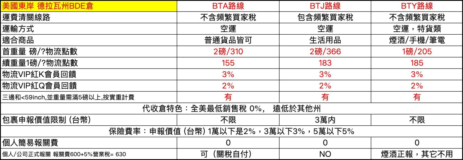 | BDE美東德拉瓦免稅州一般倉 | 5 | 2.5 | 15 | 0 | 0 | 630 | 0 | 1.25 | 120 | 2.5 | 3 | 不提供 | 不提供 |